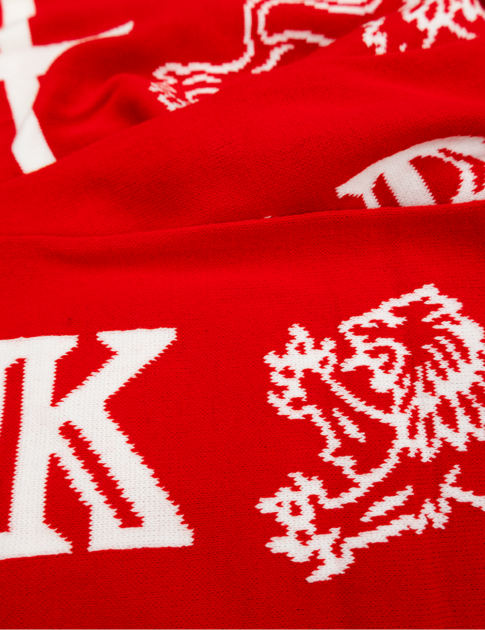 Et klassisk DIU halstørklæde i de danske farver, rød og hvid. Det er designet med den officelle danske løve, som symboliserer det danske ishockey landshold og det danske nationalflag i begge ender. En nødvendighed når det er tid til at støtte op om vores alle sammens landshold.