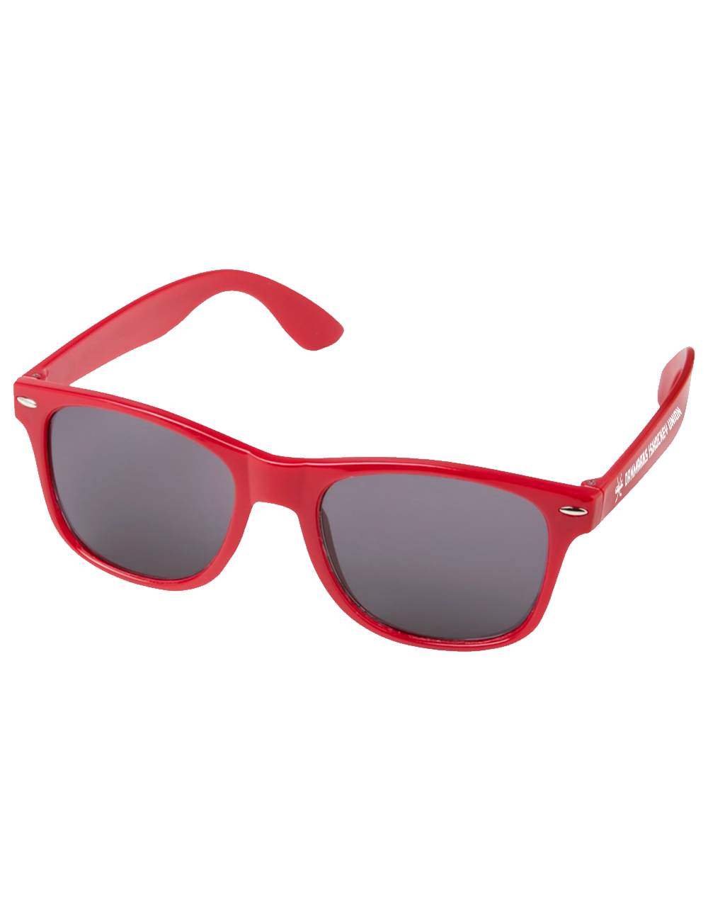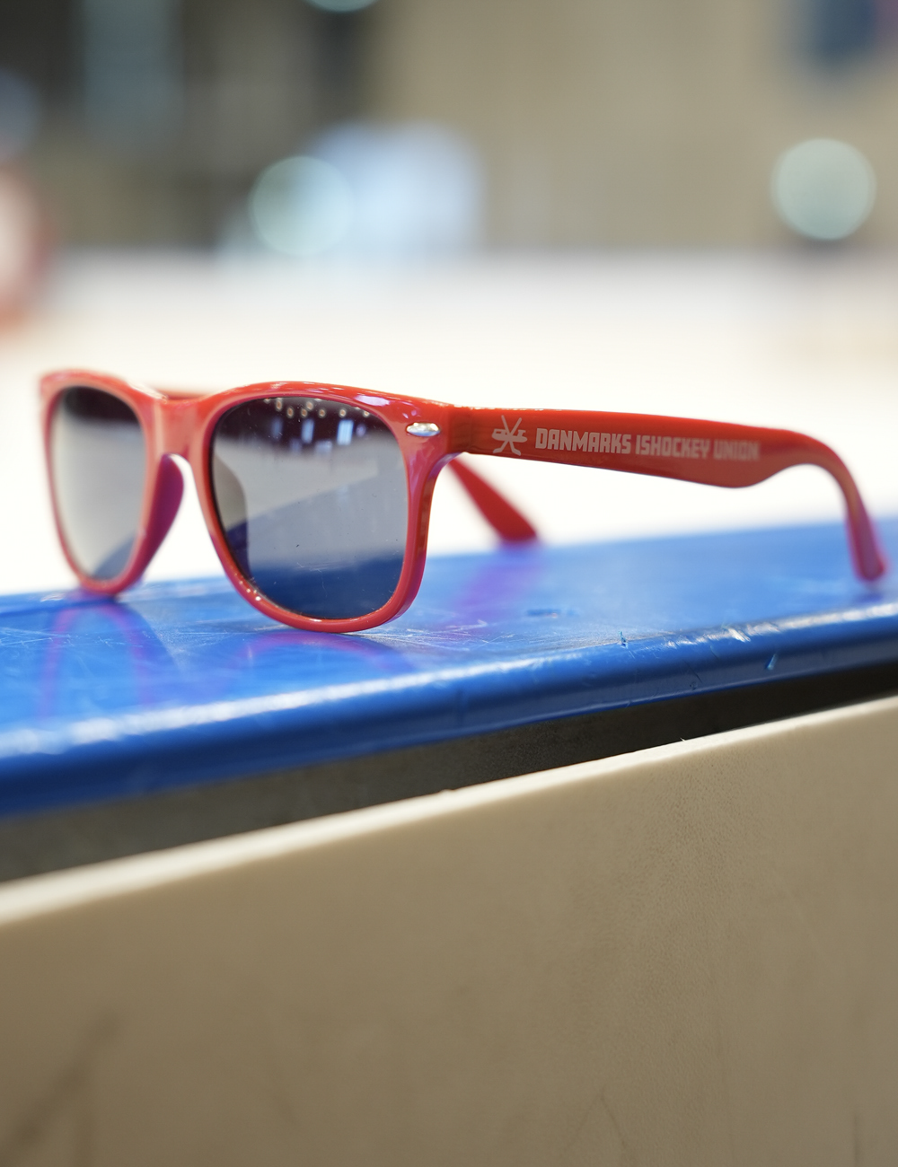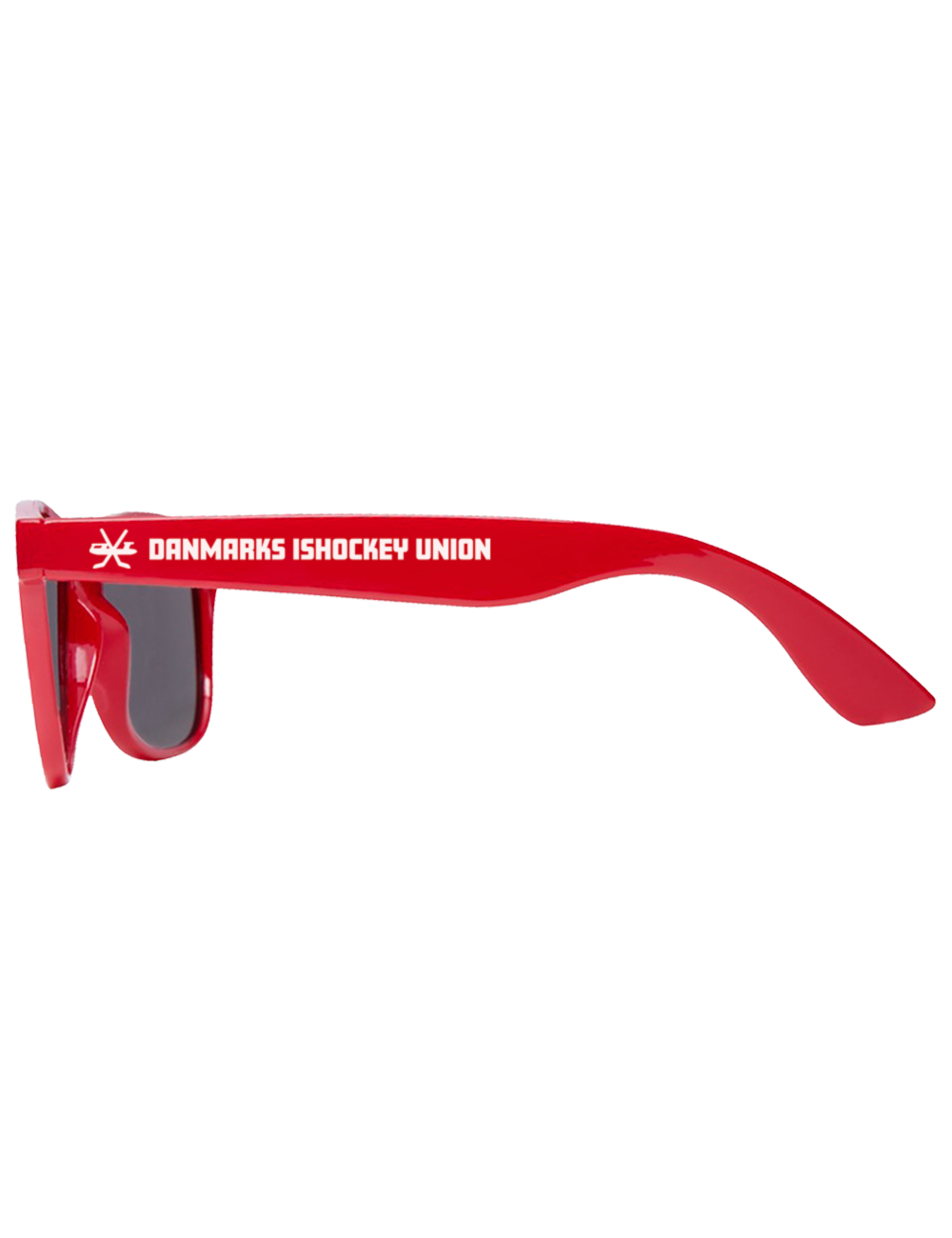 Klassiske solbriller lavet i landsholdsfarverne rød og hvid tekst på siderne, hvor der står: DANMARKS ISHOKCEY UNION. Solbrillerne er uundværlige når solen skinner, og med disse solbriller ved hånden vil du altid være klar, hvis solen dukker op.